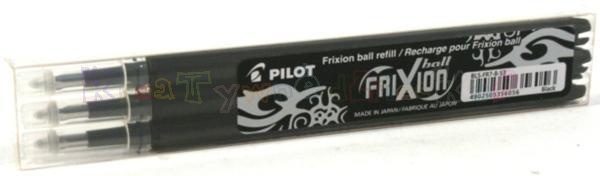 Trzy wkłady w kolorze czarnym do pióra ścieralnego Pilot Frixion. Grubość pisanej linii 0,5 mm.