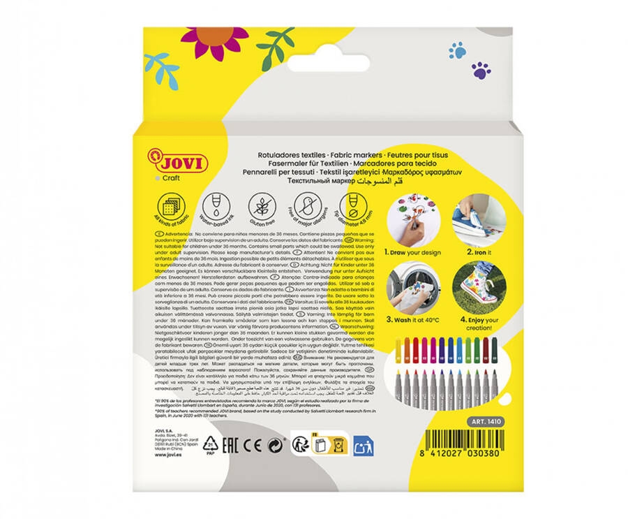 Zestaw składa się z 12 markerów do tkanin z tuszem na bazie wody. Po zaprasowaniu pomalowanej tkaniny, flamastry stają się odporne na zmywanie - tkaninę można prać w pralce w temperaturze do 40 ºC. Flamastry nadają się do ozdabiania każdego rodzaju tkaniny. Elastyczna końcówka, o grubości 4,8 mm umożliwia kreślenie grubych i cienkich linii.