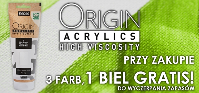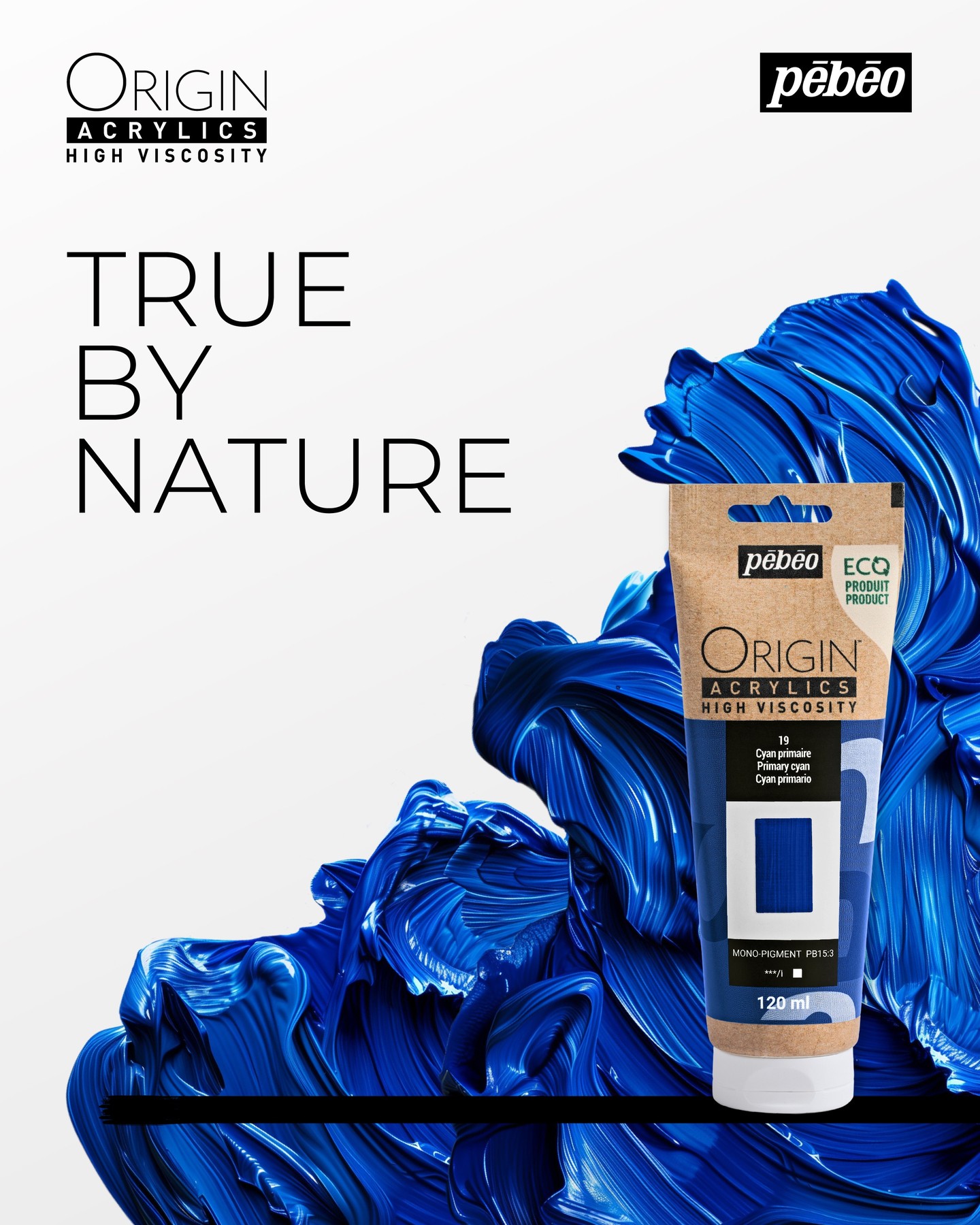 Seria produktów zaprojektowana w trosce o środowisko naturalne. Spoiwo farb Pebeo Origin Acrylics w 100% pochodzi z recyklingu, zmniejsza to ślad węglowy o 80% w porównaniu ze spoiwem niepochodzącym z recyklingu. Farby wyprodukowano we Francji, w 96% z surowców europejskich. Każda farba ma eko-tubę wykonaną z papieru PE z certyfikatem FSC®, co pozwala zmniejszyć ilość plastiku o 59%*.