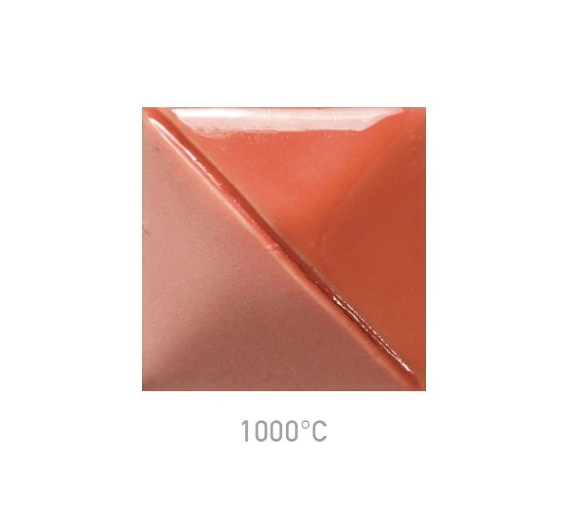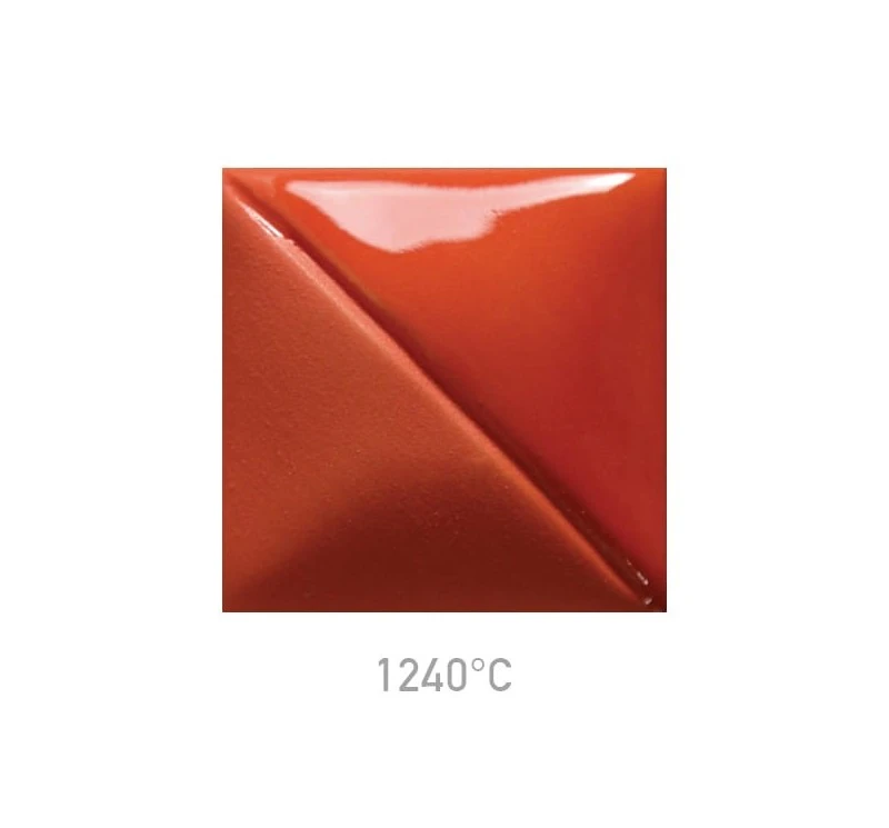 Farba podszkliwna Mayco UG-204 Orange przy wypale na niską temperaturę daje jasny, pomarańczowy kolor, który wraz ze wzrostem temperatury wypału ciemnieje.