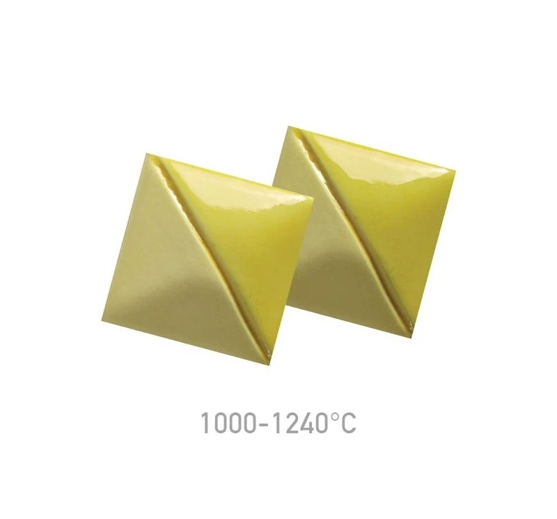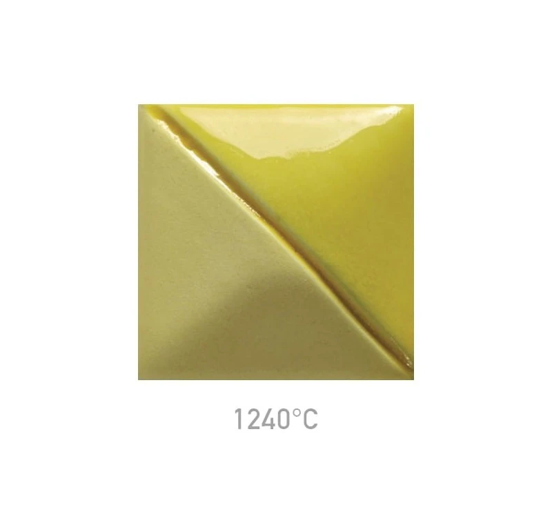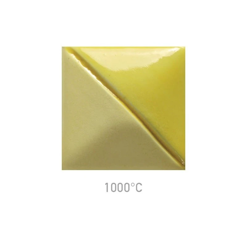 Farba podszkliwna Mayco UG-46 Bright Yellow przy wypale na niską temperaturę daje intensywny, żółty kolor, który wraz ze wzrostem temperatury wypału nieznacznie ciemnieje.