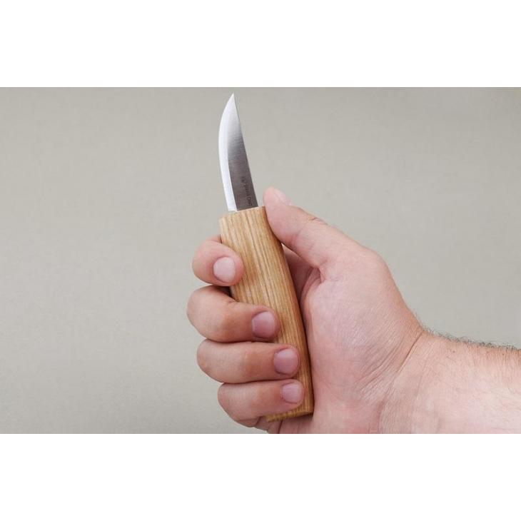 Mały uniwersalny nożyk rzeźbiarski o wszechstronnym zastosowaniu. Sprawdzi się przy struganiu, usuwaniu większych partii materiału, jak i trasowaniu oraz rzeźbieniu łagodnych krzywizn, z także chip-carvingu. Przydatny w różnych formach pracy z drewnem oraz rękodzielnictwie.