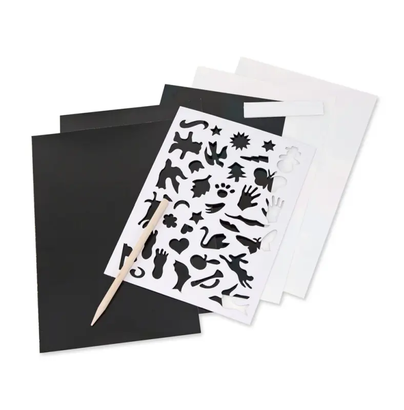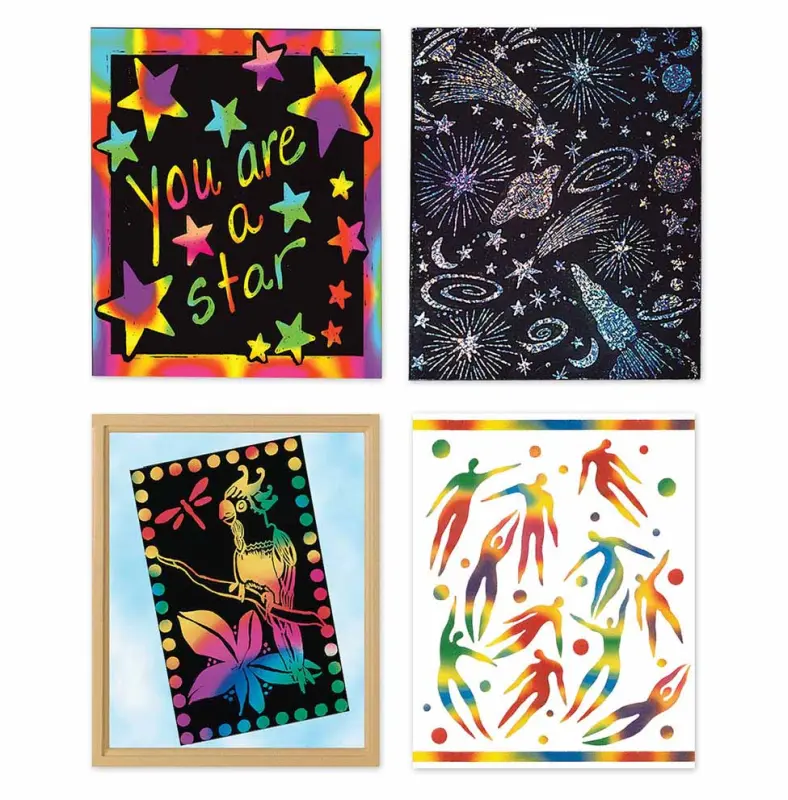 Łatwy w użyciu zestaw "Wydrapywanek" zawiera cztery arkusze różnych wzorów: wielokolorowy, wielokolorowy na białym tle, srebrny z efektem holograficznym i przyciągający światło. Każdy rodzaj oferuje unikalny efekt podczas rysowania, techniki akwaforty a także idealny wstęp do techniki wydrapywania. Zestaw ćwiczy koordynację ręka-oko, motorykę małą a także wpływa pozytywnie na kreatywność.Odpowiednie dla dzieci w wieku 4 lata+.