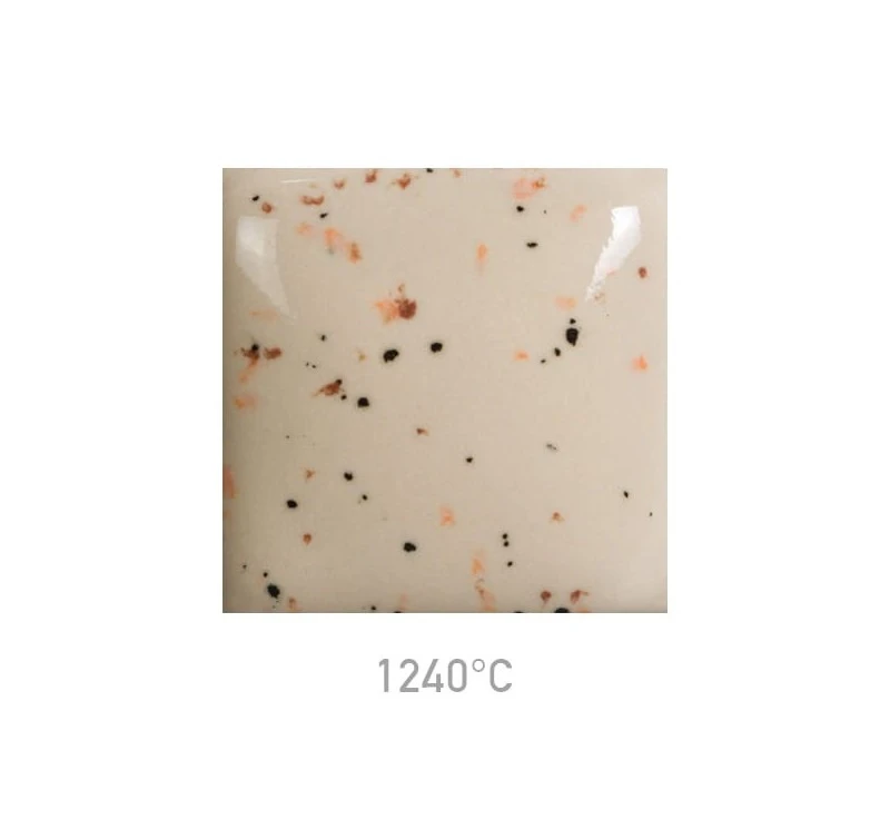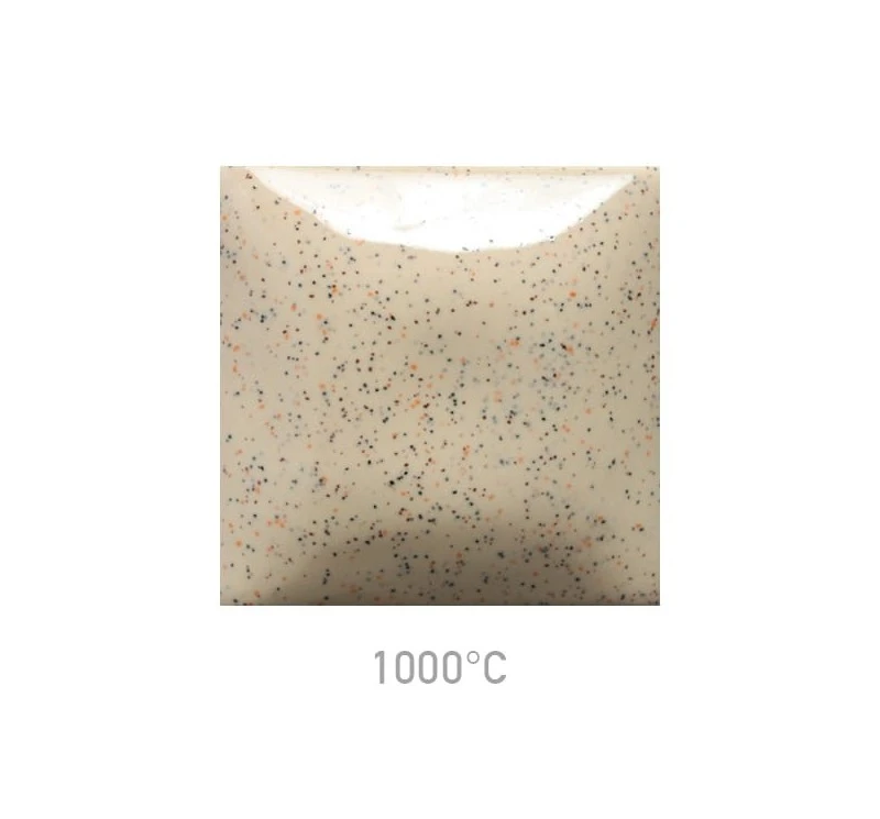 zkliwo Mayco SP-254 Speckled Vanilla Dip przy wypale na niską temperaturę daje zielony kolor z małymi, czarnymi kropkami. Wraz ze wzrostem temperatury wypału kropki rozlewają się i jaśnieją.