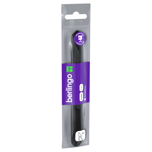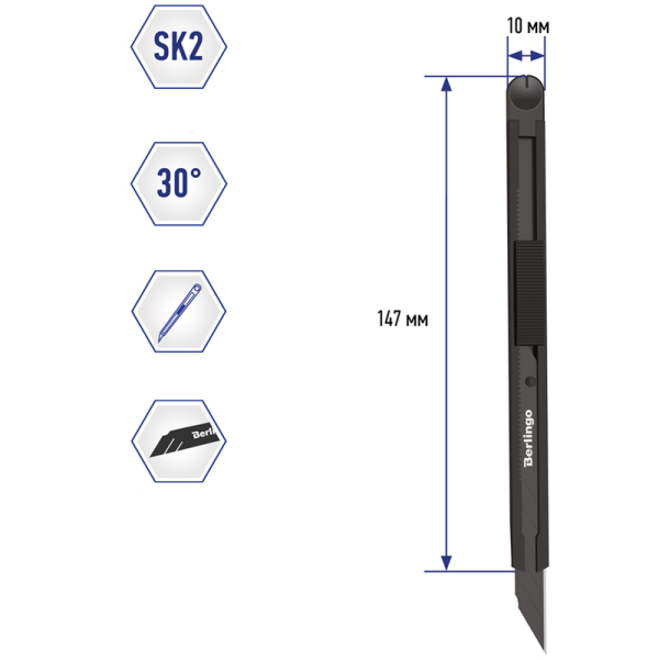 Rodzaj ostrza - stal SK2 o kącie 30°. Nóż biurowy precyzyjny z automatycznym systemem mocowania ostrza oraz z automatyczną blokadą. Korpus noża jest całkowicie metalowy. Kolor obudowy - czarny. W zestawie wytrzymałe, czarne ostrze ze stali SK2 o kącie 30°. SK2 to rodzaj stali matrycowej o wysokiej twardości, odporności na zużycie, wytrzymałości i obróbki. Ukośne grawerowanie laserowe pozwala na odłamanie zużytej części noża dokładnie w miejscu zaznaczenia.
