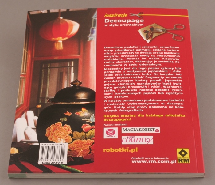 Drewniane pudełka, ceramiczne wazy, plastikowe półmiski, szklane świeczniki – przedmioty, które dodają uroku każdemu wnętrzu, zwłaszcza kiedy są odpowiednio ozdobione. Możesz im nadać niepowtarzalny charakter, dekorując je techniką decoupage’u w stylu orientalnym. Wystarczy mieć papier ryżowy lub pergamin z motywami japońskimi i chińskimi oraz kolorowe farby. Na lampion, wazon lub szkatułkę możesz nakleić serwetki przedstawiające chińskich mandarynów, japońskie gejsze, kwiaty peonii bądź kwitnące gałązki brzoskwiń i wiśni. Wachlarze, szafkę i poduszki możesz ozdobić rysunkami bambusowych pędów lub egzotycznych ptaków. Przekonaj się, jakie to proste! Pracę ułatwią Ci fotografie oraz instrukcje krok po kroku.