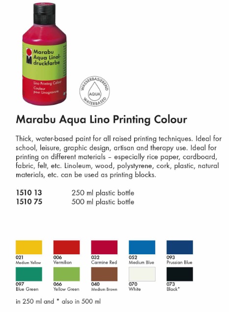 Farba do linorytu (tusz kreślarski) na bazie wody. Farba ma wiele zastosowań graficznych. Charakteryzuje się intensywnym kolorem i dobrym kryciem, nie wymaga rozcieńczania, jest gotowa do użycia.