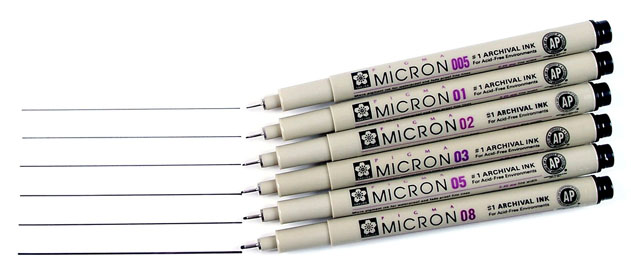 Sakura Pigma Micron najbardziej popularne cienkopisy na rynku graficznym. Swoją jakość zawdzięczają tuszowi Archival, który charakteryzuje się głęboką czernią, permanentnością, wodoodpornością. Dodatkowo skład tuszu jest nietoksyczny i całkowicie bezpieczny dla zdrowia i środowiska. Końcówka cienkopisu dozuje tusz, ale nie drapie papieru i jest niezwykle wytrzymała. Końcówka w precyzyjnej stalowej rurce umożliwia także na idealne kreślenie linii przy pomocy linijki. Linie wykonane tymi cienkopisami są bardzo światłotrwałe, nie blakną z upływem czasu. I co najważniejsze – nie przebijają na drugą stronę najcieńszej nawet kartki. Po cienkopisy firmy Sakura Pigma Micron chętnie sięgają ilustratorzy, rysownicy komiksów, mangi, architekci, pisarze i artyści, którzy stawiają na profesjonalne cienkopisy w przystępnej cenie. Dostępne w 6 rozmiarach: 005 (0.20 mm), 01 (0.25 mm), 02 (0.30 mm), 03 (0.35 mm), 05 (0.45 mm), 08 (0.50 mm) oraz różnych kolorach.