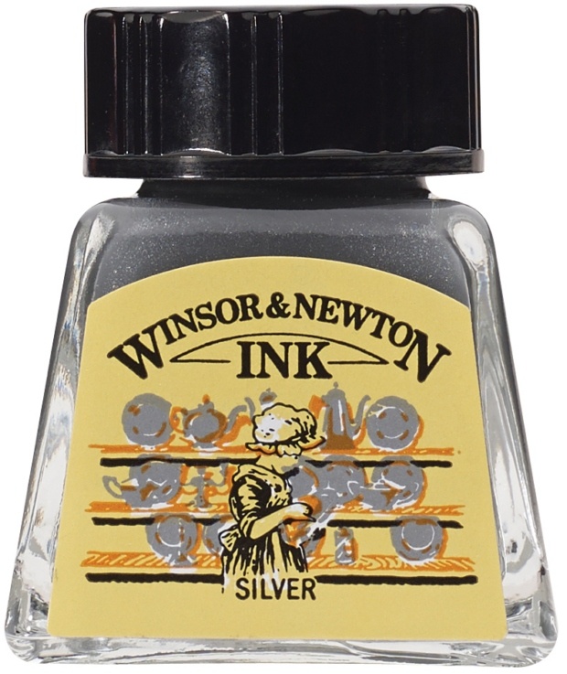 Tusz rysunkowy angielskiej firmy Winsor & Newton w kolorze Silver. Tusz wysokiej jakości, należy go rozcieńczać wodą destylowaną. Tusz charakteryzuje się dużym kryciem. Całość w szklanym kałamarzu o pojemności 14ml.