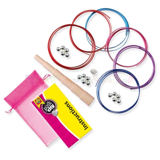 Zestaw do samodzielnego zrobienia kolorowych pierścionków z aluminiowych drucików i ozdób. W zestawie dziecko znajdzie specjalną miarkę dzięki czemu wykonane pierścionki będą pasować na paluszek.