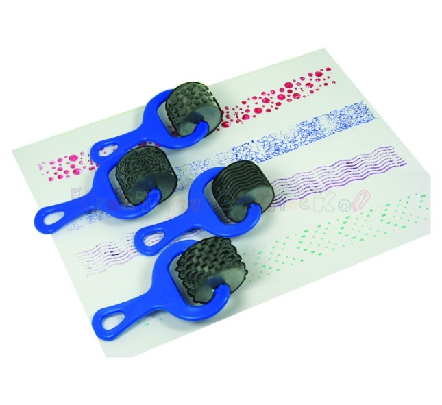 Zestaw czterech gumowych wałków do faktur. Wałki można używać do malowania farbą oraz przy pracy z masami plastycznymi.
