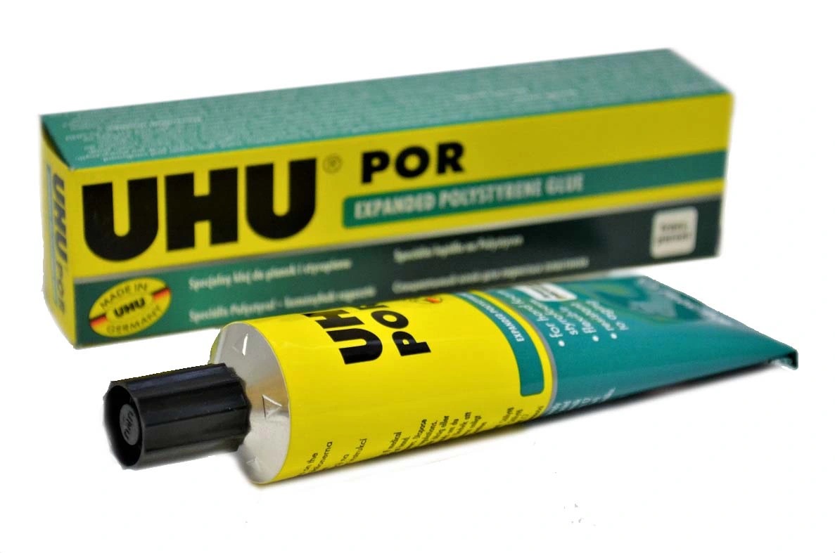 Klej UHU Por to szybko wysychający, środek przeznaczony do kontaktowego klejenia pianek polistyrenowych (styropianu). Transparentny - spoina pozostaje prawie bezbarwna i wodoodporna. Klej charakteryzuje się wysoką odpornością na starzenie. Powłoka kleju jest wolna od kwasów i alkalii