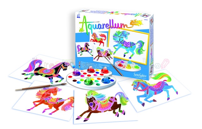 Z AQUARELLUM każdy jest wstanie namalować piękne obrazy metodą akwareli. Szkice zabezpieczone są lekko wystającą obwódką utrudniającą "wychodzenie za linię" pędzelkiem, a w miarę zamalowywania obrazu pojawiają się delikatne motywy dekoracyjne. Wzory zestawów AQUARELLUM cechuje atrakcyjny design, kolory farb są jasne, intensywne, pięknie się mieszają. Załączona pipeta umożliwia łączenie kolorów na plastikowej palecie dając nieskończone możliwości tworzenia.