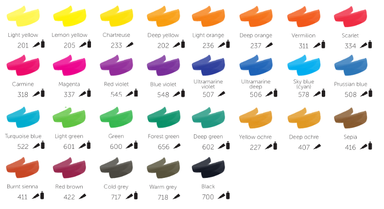 Paleta kolorów obejmuje 46 przezroczystych i rozcieńczalnych w wodzie kolorów oraz dodatkowo 2 kolory nieprzezroczyste, biały i złoty - wszystkie te kolory można mieszać z pisakami.