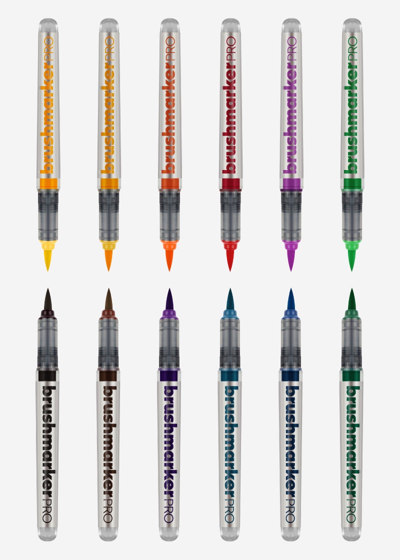 BrushmarkeryPRO zawierają 2,4 ml farby. Zostały wyprodukowane w technologii „płynnego atramentu” dzięki czemu nie zmieniają intensywności barwy aż do ostatniej kropli oraz pozwalają na bieżąco kontrolować ilość farby. Są dwukrotnie bardziej wydajne od tradycyjnych markerów filtrowych. Dodatkowo wyposażone są w japońską bardzo wytrzymałą i super elastyczną końcówkę nylonową. Zawierają nietoksyczne farby o intensywnej barwie na bazie barwników. Kolory można mieszać, rozjaśniać i uzyskiwać przejścia tonalne stykając końcówki markerów.