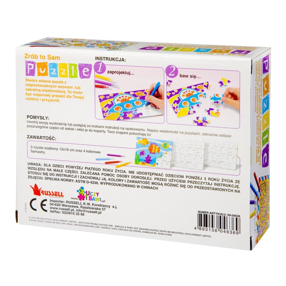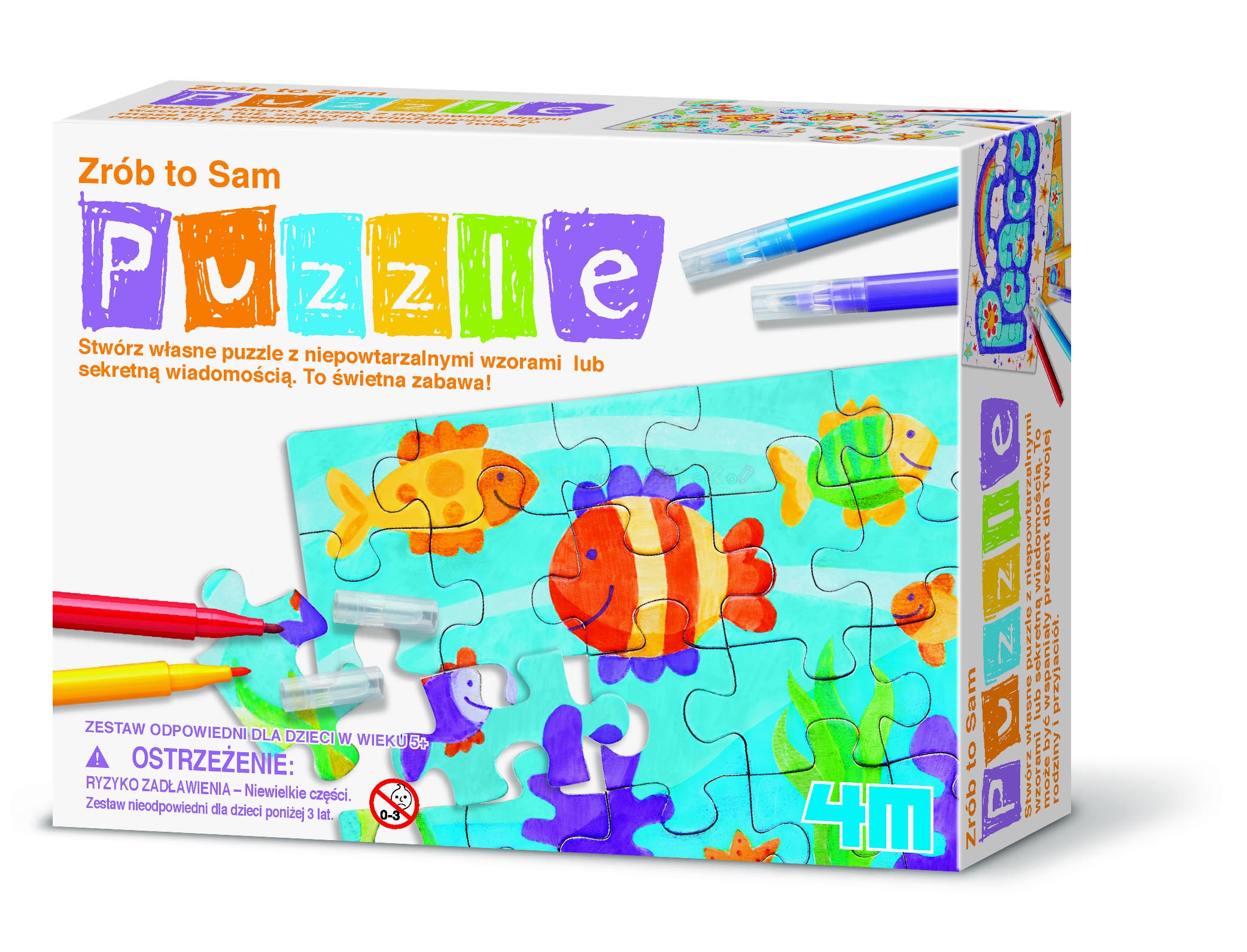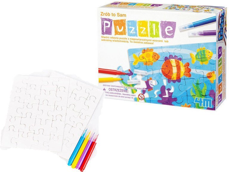 Mini Puzzle 4M to wyjątkowo kreatywna zabawa, tu obrazek do układania tworzy samo dziecko. Zestaw składa się z trzech plansz - białych puzzli. Można próbować je układać bez obrazka, można na nich napisać sekretną wiadomość po czym dać ją komuś do ułożenia i przeczytania, można narysować obrazek czy laurkę - tu ograniczeniem jest tylko wyobraźnia dziecka!