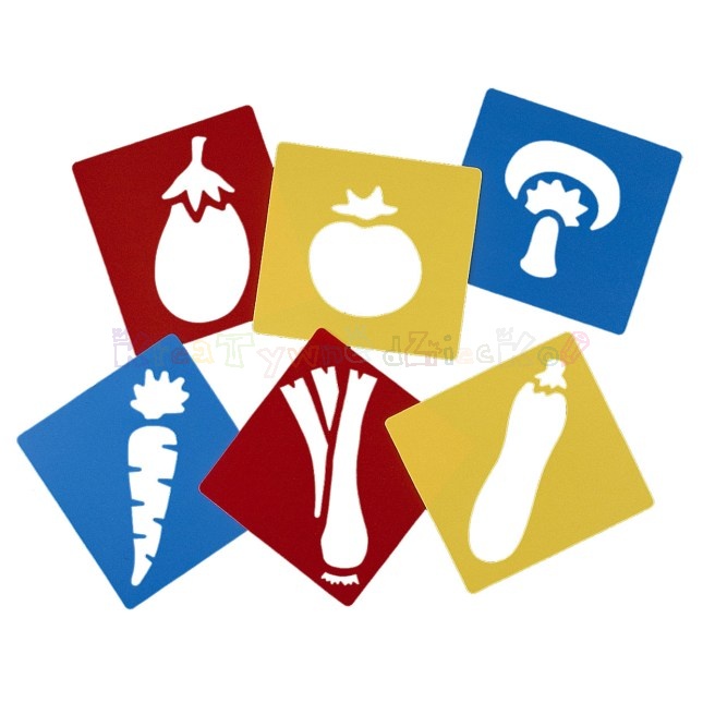 Zestaw 6 plastikowych szablonów z motywem warzyw. Szablony są bardzo trwałe, łatwe do umycia. Można ich używać do odrysowywania kształtów kredkami, flamastrami lub farbami.