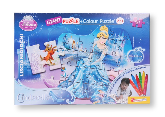 Kreatywne puzzle dwustronne przedstawiające KOPCIUSZKA w pięknej, balowej aurze, w komplecie z 6 dużymi flamastrami.