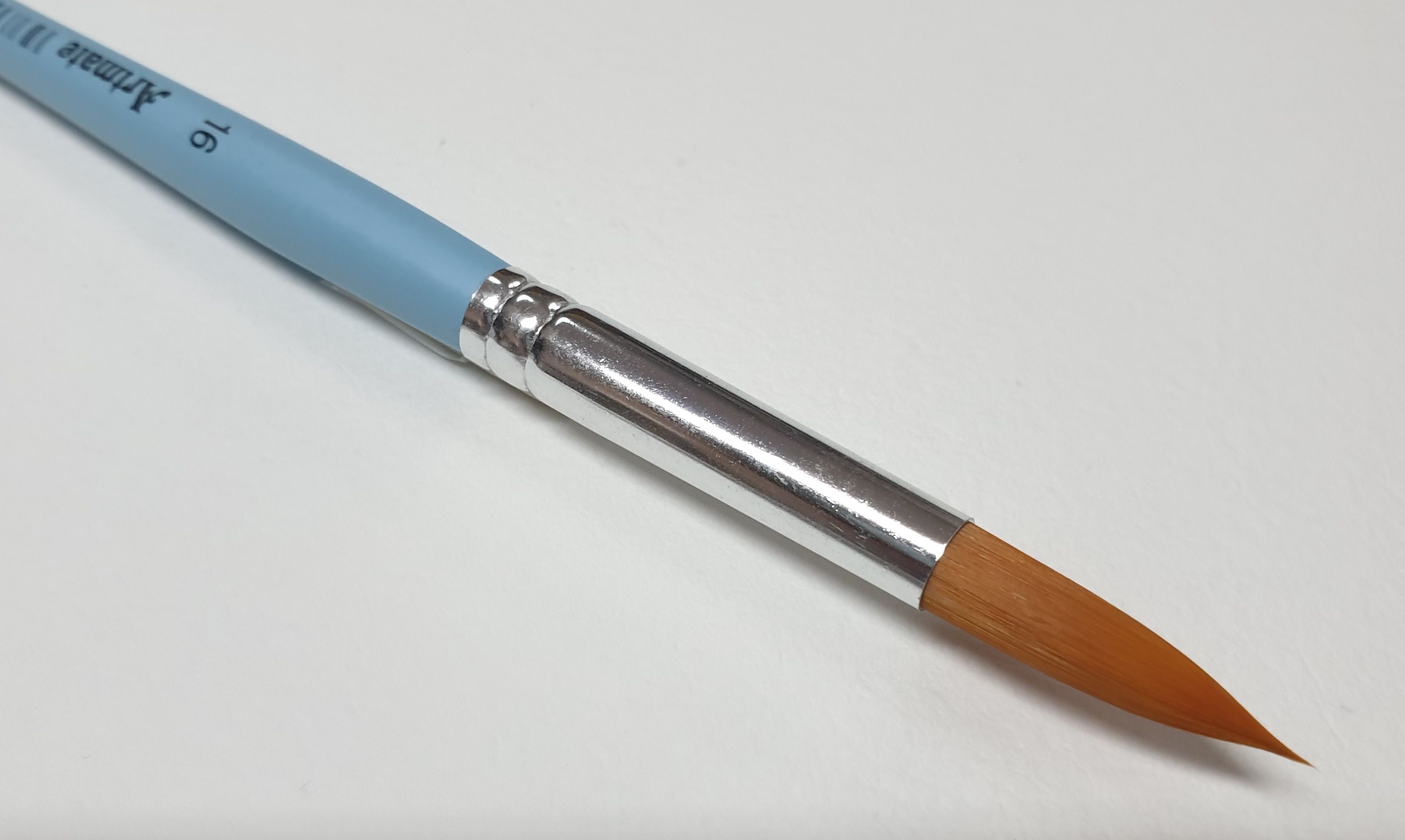 Pędzel nylonowy okrągły Artmate Nr 16 do technik wodnych i olejnych. Włosie pędzla jest syntetyczne, barwione na pomarańczowo z niebieską nielakierowaną rączką.
