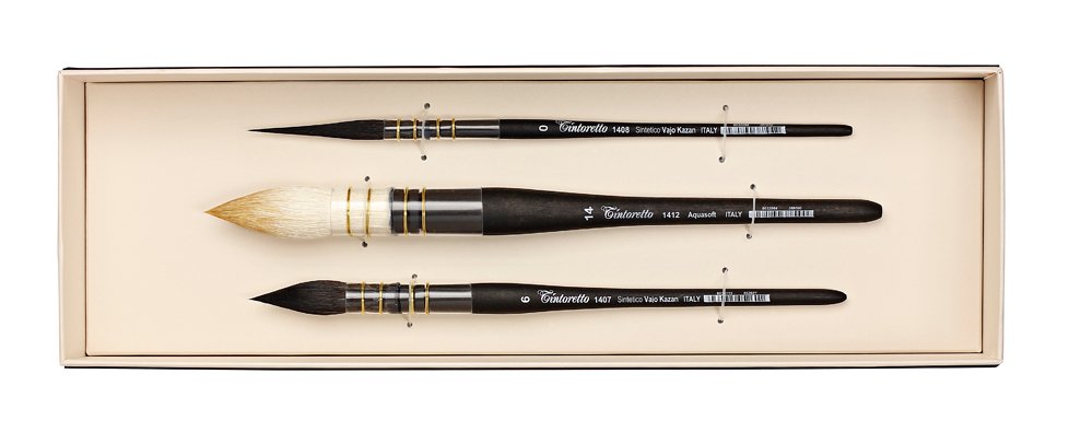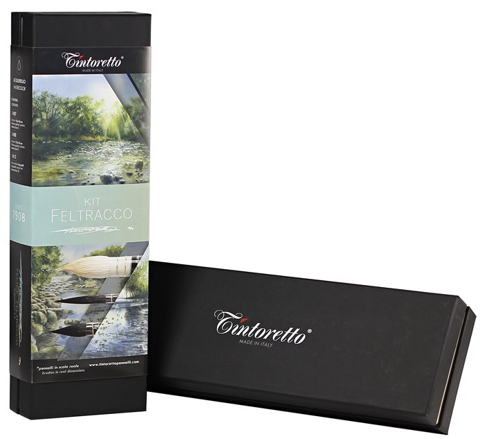 Zestaw zawiera mop do akwareli z syntetycznym włosiem imitującym wiewiórkę kazańską (seria 1407, rozmiar 6), pędzel z wydłużonym włosiem imitującym wiewiórkę kazańską (seria 1408, rozmiar 0), a także mop z najwyższej jakości naturalnego, białego włosia koziego (seria 1412, rozmiar 14). Zestaw został stworzony we współpracy z wybitnym włoskim akwarelistą Felice Feltracco.