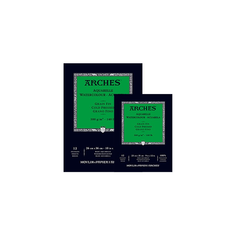 Blok akwarelowy drobnoziarnisty Arches Aquarelle. Zawiera 12 arkuszy papieru w rozmiarze 23 x 31cm i gramaturze 300 g/m².