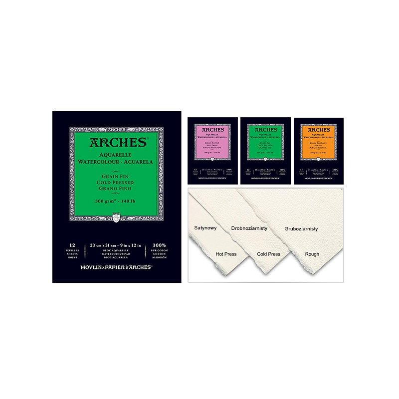 Papiery bloków Arches występują w trzech odmianach: satynowej, drobnoziarnistej i gruboziarnistej. Różnice opierają się o strukturę powierzchni arkusza, a każdy z nich dedykowany jesto dmiennym zastosowaniom (portrety, pejzaże) i twórcom (profesjonalistom i amatorom).
