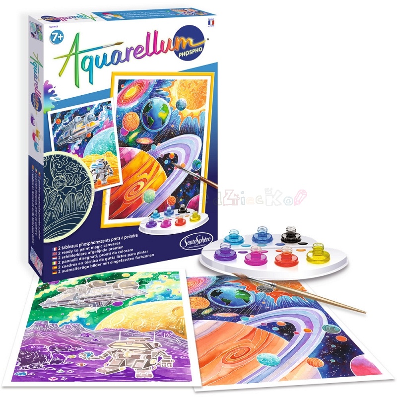 Z AQUARELLUM każdy jest wstanie namalować piękne obrazy metodą akwareli. Szkice zabezpieczone są lekko wystającą obwódką utrudniającą "wychodzenie za linię" pędzelkiem, a w miarę zamalowywania obrazu pojawiają się delikatne motywy dekoracyjne. Wzory zestawów AQUARELLUM cechuje atrakcyjny design, kolory farb są jasne, intensywne, pięknie się mieszają. Załączona pipeta umożliwia łączenie kolorów na plastikowej palecie dając nieskończone możliwości tworzenia.