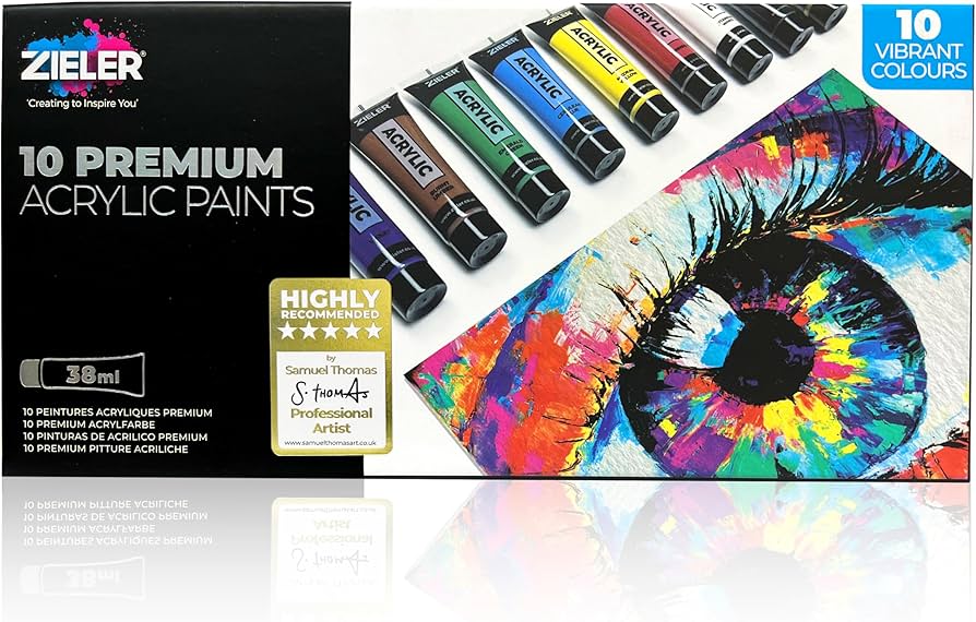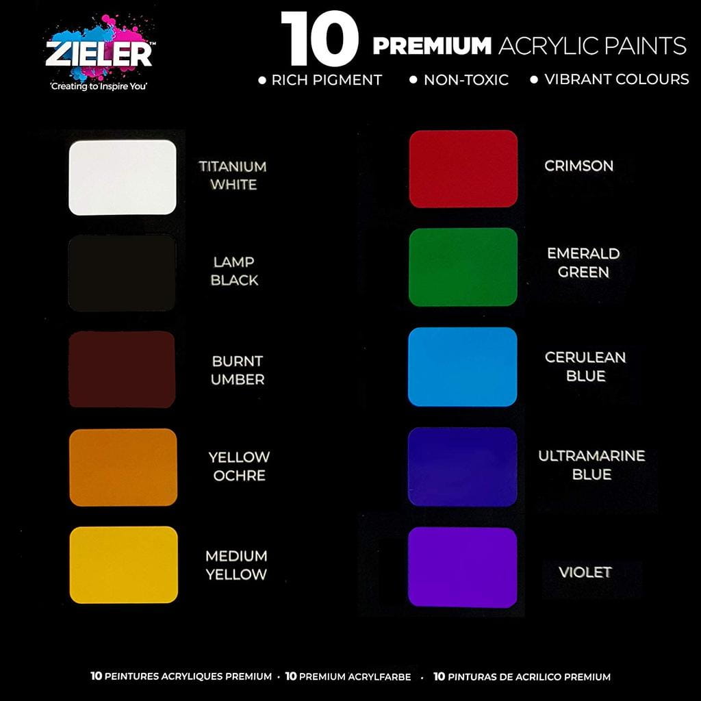Komplet dziesięciu farb akrylowych Zieler - (dawne Pablo) w eleganckim czarnym opakowaniu z metalicznymi elementami. Farby te gorąco poleca profesjonalny artysta Samuel Thimas. Farby są nietoksyczne oraz szybkoschnące, bardzo dobrze mieszają się ze sobą. Wysoka odporność na światło.
