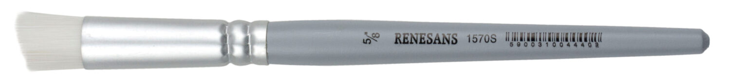 Pędzel syntetyczny okrągły skośny z serii 1570S posiada syntetyczny, sprężysty włos. Biały włos osadzony jest w metalowej skuwce na krótkim, szarym trzonku wykonanym ze specjalnego tworzywa, które pod wpływem wody nie odkształca się. Pędzel doskonale nadaje się do pracy z pigmentami, suchymi pastelami, oraz masami plastycznymi i gęstymi farbami. Świetnie sprawdza się w malowaniu suchą pastelą na papierze zamszowym doskonale blendując kolory. W pracy z farbami pozostawia ślady włosia tworząc ciekawą fakturę.