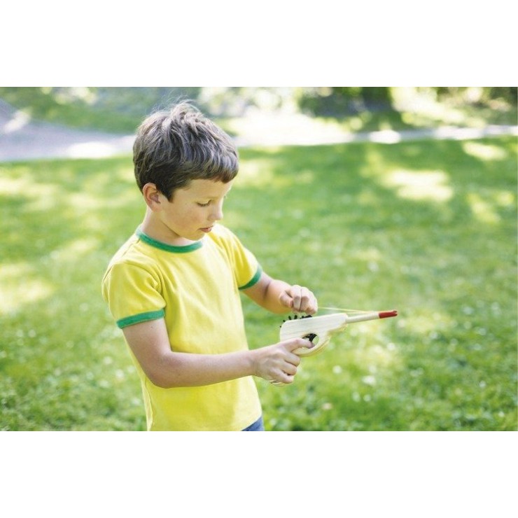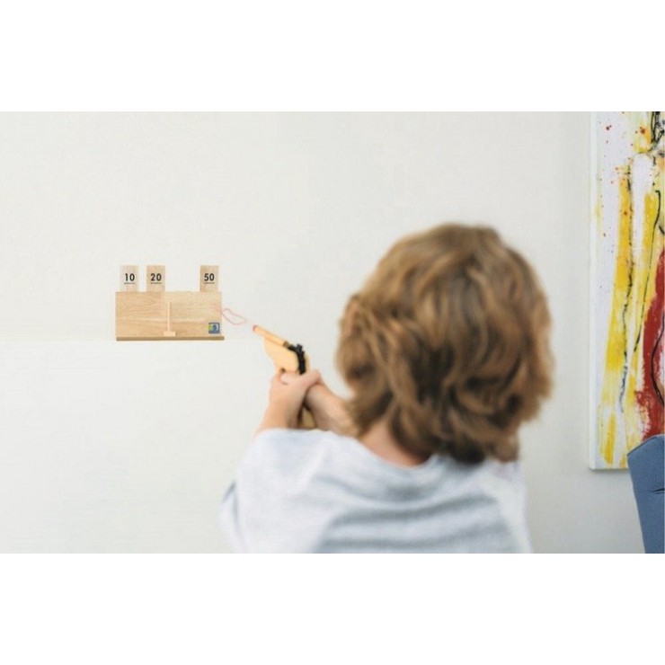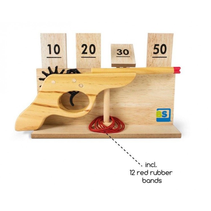 Do zestawu dołączone są gumki recepturki oraz pistolet z ruchomą zębatką, która po naciśnięciu spustu powoduje uwolnię się gumki i oddanie strzału do celu. Zręcznościowa rozrywka dla całej rodziny.