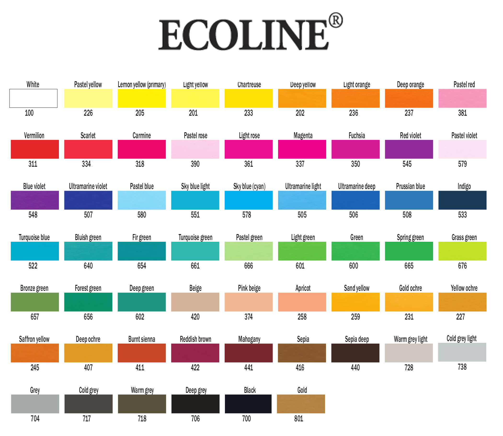 Zakres dostępnych kolorów Ecoline zawiera także 3 kolory podstawowe: żółty cytrynowy, fuksyna, oraz błękitny cyjan (205, 337, 578) przeznaczonych głównie do ćwiczeń w tworzeniu kolorów.