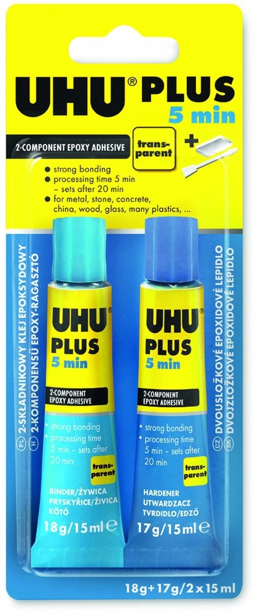 Klej epoksydowy UHU Plus 5 min jest klejem dwuskładnikowym na bazie żywic epoksydowych, co umożliwia uzyskanie złącza o najwyższej wytrzymałości (bez rozpuszczalników). Czas użycia wynosi 5 min. Po 20 minutach otrzymuje się połączenie wstępne, po 1 h wytrzymałość końcową. Klej po utwardzeniu staje się przeźroczysty. Jest odporny na działanie rozcieńczonych kwasów, zasad, benzyny, paliwa modelarskiego wielu rozpuszczalników i wody.