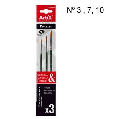 Zestaw pędzli nylonowych o brązowej rączce. W skład zestawu wchodzą pędzle okrągłe ( rozmiar 10, 7 i 3). Przeznaczone są do farb akrylowych, akwareli oraz tempery.