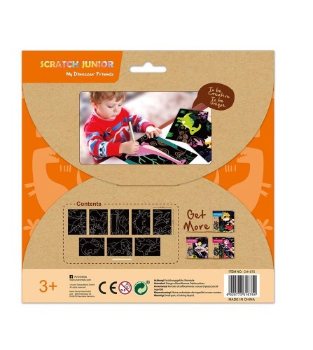 W zestawie: 8 wydrapywanek z kolorowymi obrazkami, patyczek do zdrapywania.