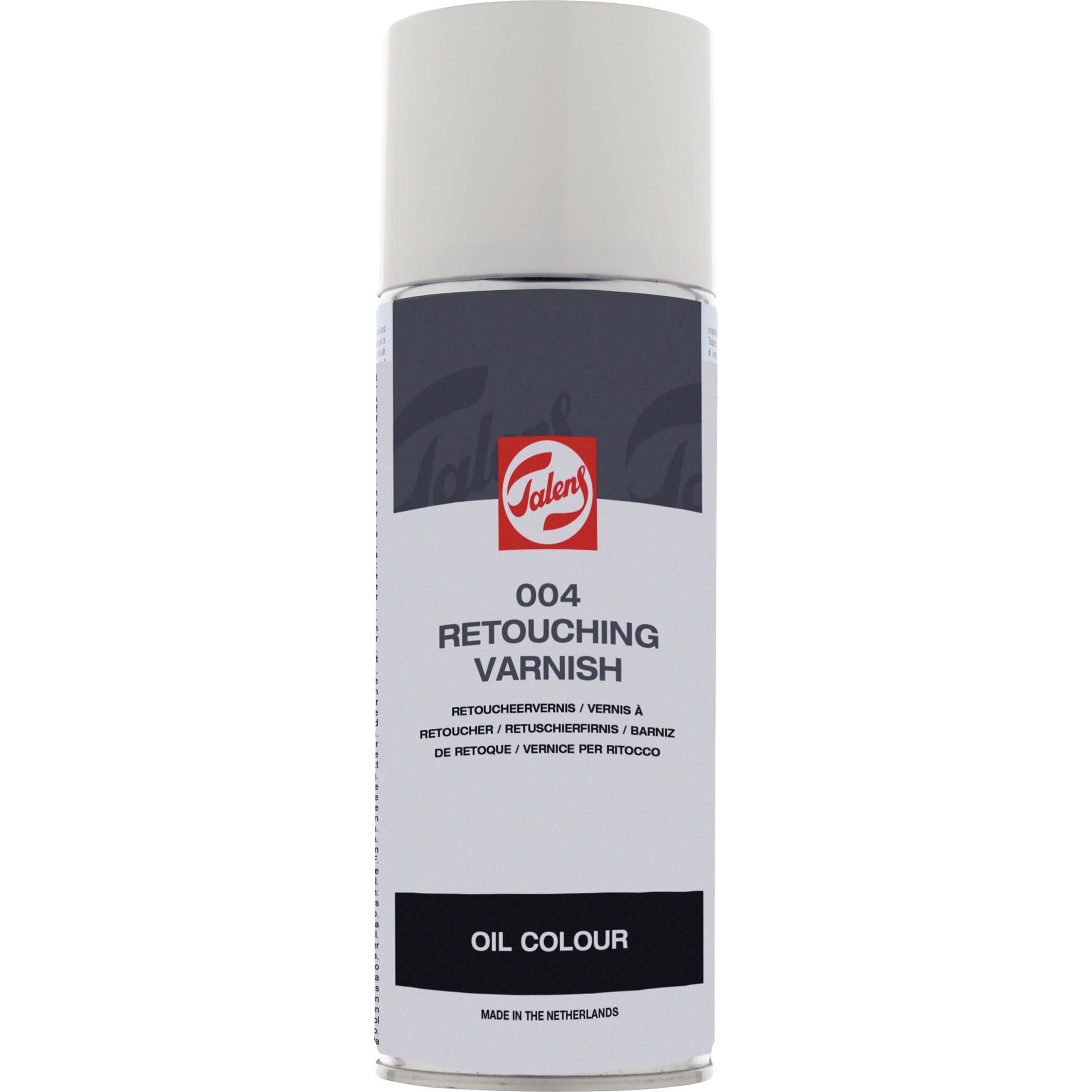 Werniks retuszerski Talens 004 Retouching Varnish. Służy do tymczasowego zabezpieczania niewyschniętego obrazu olejnego oraz retuszu matowych miejsc. Jako tymczasowy werniks nanieść po 2-3 miesiącach. Wysycha w ciągu kilku godzin, nie żółknie. Można go rozcieńczyć z benzyną lakową. Przechowywać w suchym i chłodnym miejscu. Nanosić z odległości 40 cm. Po zakończonej pracy aby oczyścić dyszę należy obrócić spray do góry nogami i pryskać aż przestanie.