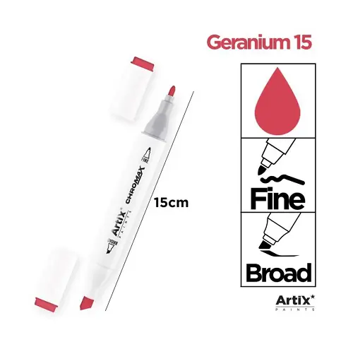 Kreatywny marker Artix Chromax z podwójną końcówką i tuszem na bazie alkoholu. Posiada plastikowy korpus. Cienka końcówka 1mm idealnie nadaje się do rysowania detali, zaś ścięta 2-5 mm do zakreślania oraz uzyskiwania specjalnych efektów. Marker znakomity do tworzenia kreatywnych rysunków, szkiców, mangi i komiksów. Idealny dla artystów hobbystów, projektantów oraz wszelkich kreatywnych zastosowań. Dostępny w szerokiej gamie kolorów.