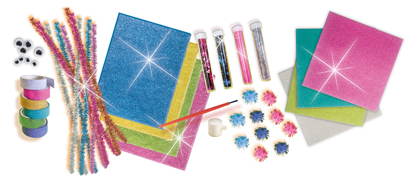 Komplet akcesoriów do prac kreatywnych dla dzieci, które kochają by ich prace naprawdę błyszczały. W żółtym pudełku Ses Creative dziecko znajdzie brokatowe: taśmy klejące, pianki eva, pompony, druciki kreatywne, papier kolorowy, klej, ruchome oczka oraz cztery fiolki z różnokolorowym, sypkim brokatem.