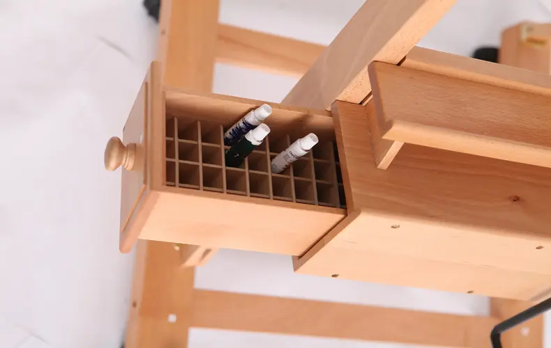 Sztaluga posiada niespotykanie pojemną dodatkową półkę na przybory, która posiada dwie boczne szuflady, każda o wymiarach 12x23x7cm - jedna posiada organizator na tubki farb.