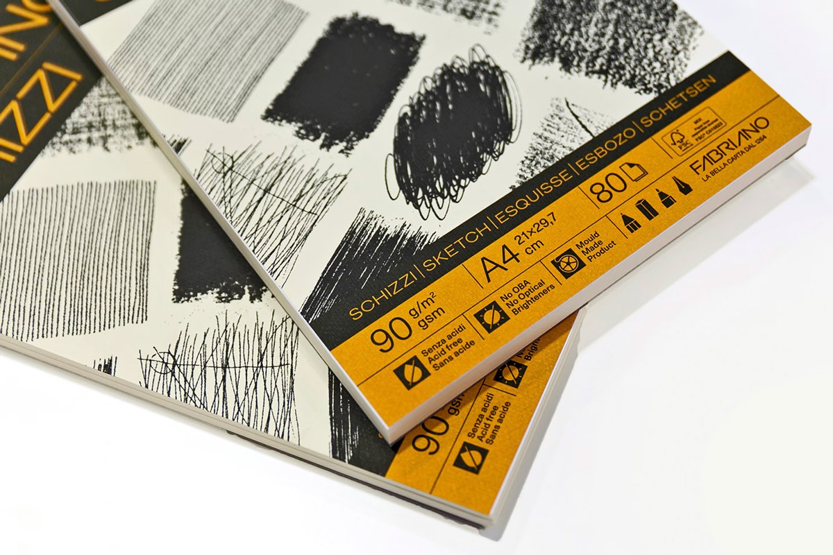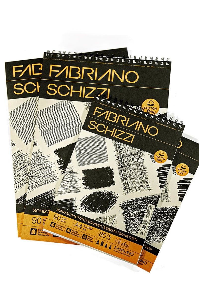 Szkicowniki Fabriano wykonane z papieru o gramaturze 90, z 20% zawartością włókien bawełnianych. Papier produkowany na maszynie bębnowej, co nadaje powierzchni lekko chropowatej powierzchni miękkości. Kolor ivory, kości słoniowej.