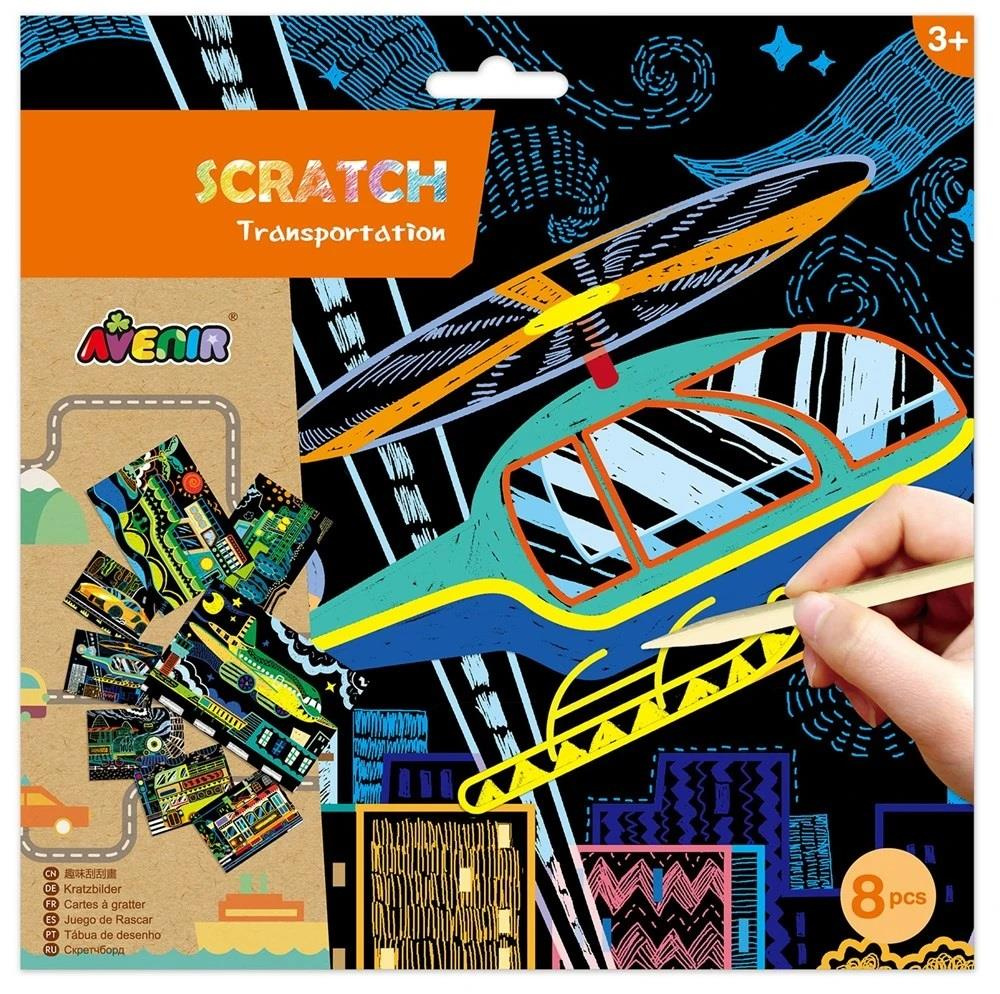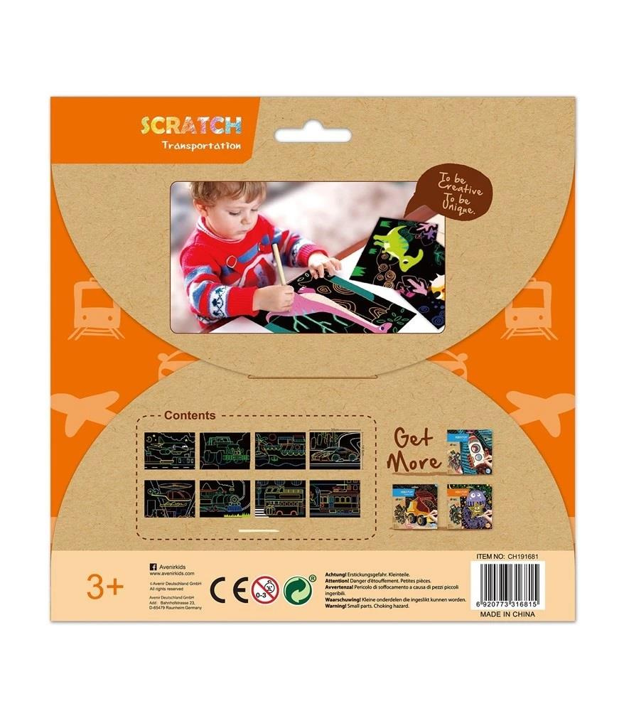 Avenir Scratch to pomysł na tworzenie kolorowych obrazków poprzez wydrapywanie. Na każdej karcie dziecko ma naniesione kontury obrazka w obrębie, których pracuje patyczkiem by zdrapać wierzchnią warstwę i odsłonić wielobarwną warstwę spodnią.Wydrapywanki to kreatywna zabawa ale też ćwiczenie ręki. Nawet dzieci, które na co dzień nie lubią rysować i pisać przy wydrapywankach potrafią się skoncentrować - ciekawość jakie kolory skrywają się pod czarną farbą pomaga przemóc niechęć i motywują do pracy. Wydrapywanki dają też dziecku doświadczenia sensoryczne - dzięki użyciu odpowiedniego narzędzia i zachowywania się papieru podczas zabawy - dziecko odbiera nowe wrażenia dotykowe.