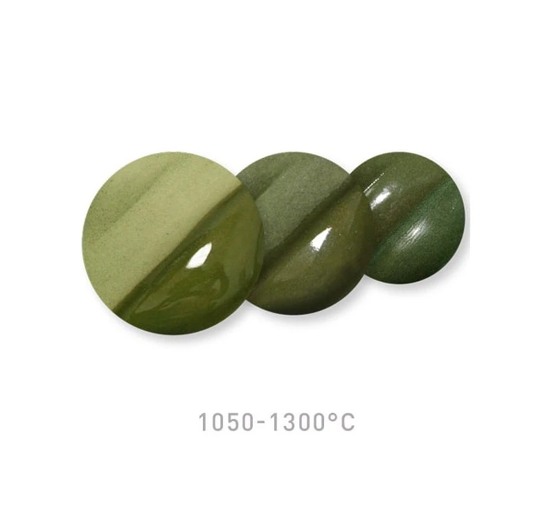 Farba podszkliwna V-333 Avocado z serii AMACO Velvet Underglazes daje jasnozielony kolor o lekko żółtym odcieniu. W raz ze wzrostem temperatury wypału kolor farby ciemnieje.
