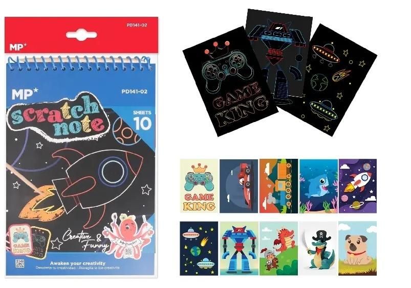 Zdrapywanka zawiera 10 arkuszy wzorów z motywami kosmicznymi w roli głównej. Na spirali.