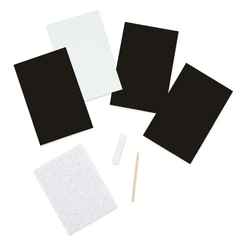 Łatwy w użyciu zestaw "Wydrapywanek" zawiera cztery arkusze różnych wzorów: wielokolorowy, wielokolorowy na białym tle, srebrny z efektem holograficznym i przyciągający światło. Każdy rodzaj oferuje unikalny efekt podczas rysowania, techniki akwaforty a także idealny wstęp do techniki wydrapywania. Zestaw ćwiczy koordynację ręka-oko, motorykę małą a także wpływa pozytywnie na kreatywność.Odpowiednie dla dzieci w wieku 4 lata+.