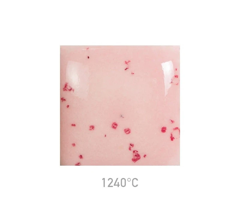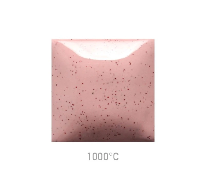 Szkliwo Mayco SP-201 Speckled Pink-A-Boo przy wypale na niską temperaturę daje różowy, pastelowy kolor z ciemnoróżowymi i jasnoszarymi kropkami. Szkliwo wraz ze wzrostem temperatury wypału nieco blednie, a ciemnoróżowe kropki rozlewają się w większe plamy.