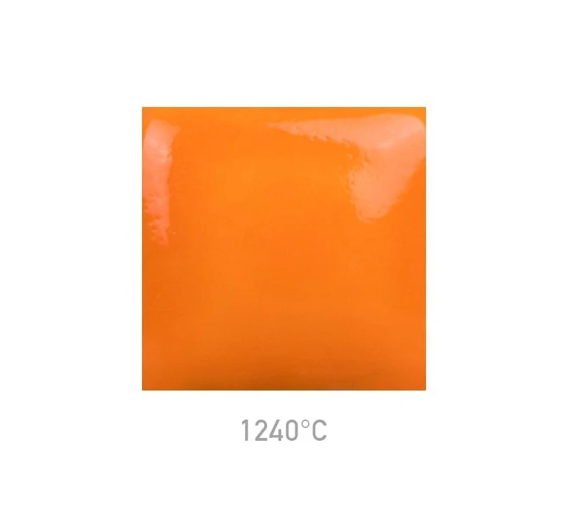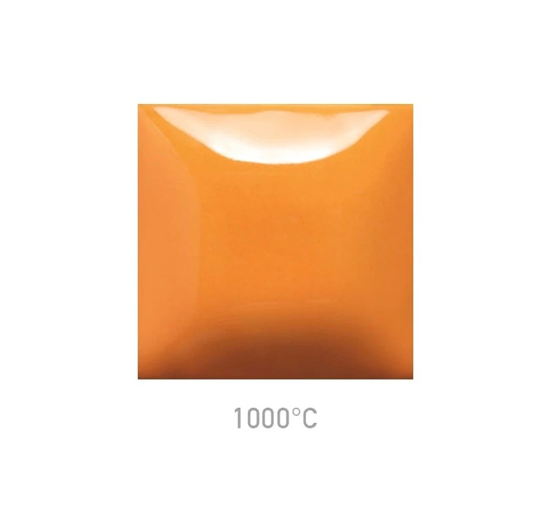 Szkliwo Mayco SC-23 Jack O'Lantern przy wypale na niską temperaturę daje mandarynkowy, pomarańczowy kolor, który wraz ze wzrostem temperatury wypału staje się intensywniejszy.