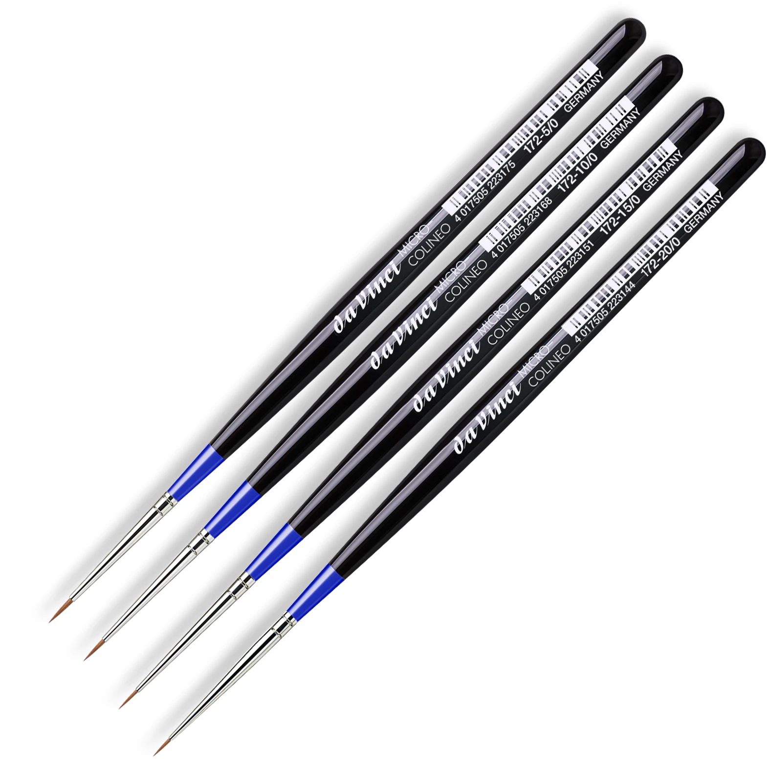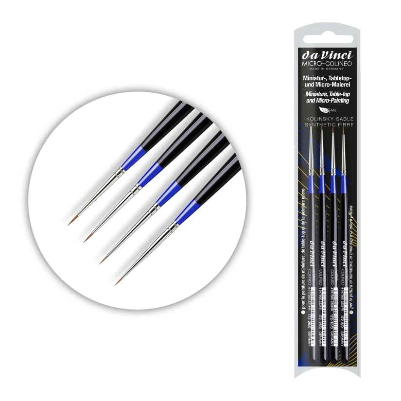 Zestaw pędzli da Vinci Micro-Colineo z serii 172 został specjalnie zaprojektowany do pracy z miniaturami, figurkami tabletop oraz mikromalowaniem. Zawiera cztery pędzle o rozmiarach 20/0, 15/0, 10/0 i 5/0, które należą do najmniejszych w ofercie – idealne do najdrobniejszych detali.