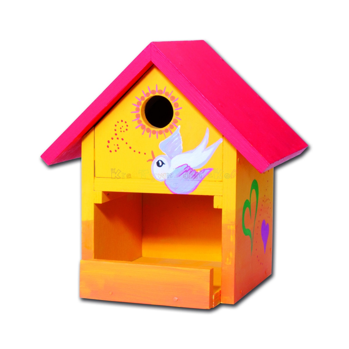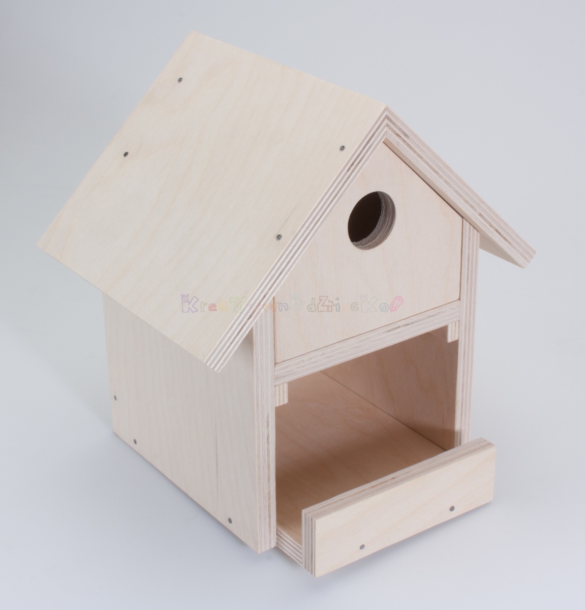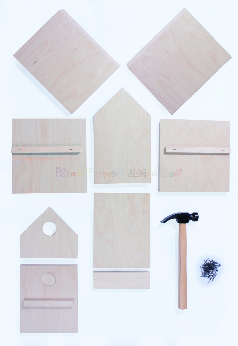 Zestaw umożliwia samodzielne zbudowanie drewnianego domku dla ptaków.
