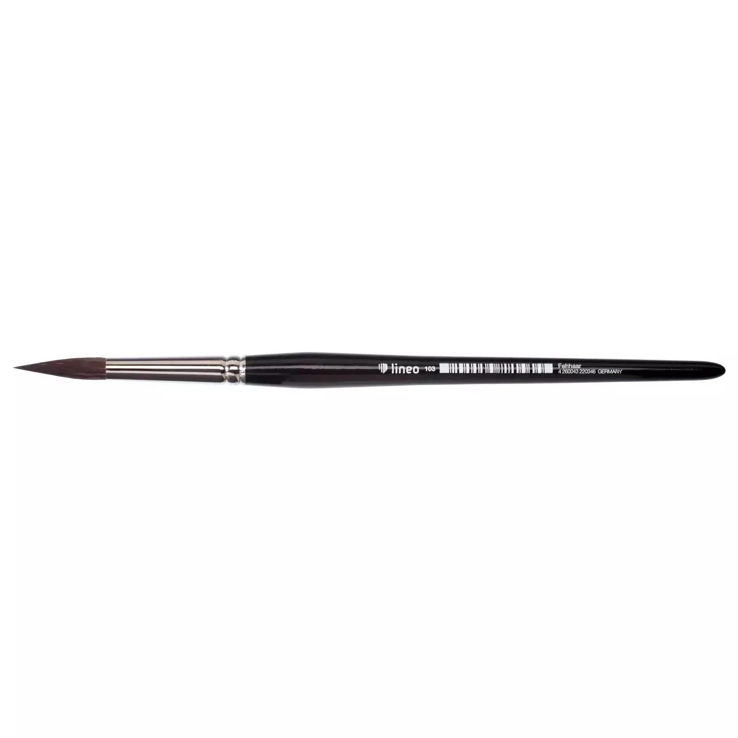 Pędzle Lineo z serii 103 charakteryzują się okrągłym kształtem oraz wysokiej jakości włosiem z wiewiórki. Bardzo miękkie, delikatne włosie nie pozostawia wyraźnych śladów, stąd pędzle tej serii są idealne do technik wodnych, szczególnie akwareli. Posiadają krótką, czarną, lakierowaną rączkę oraz niklowane, bezszwowe okucia.