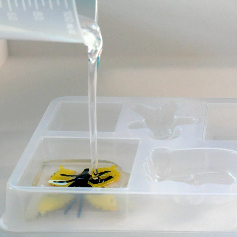 Po połączeniu żywicy z katalizatorem dziecko może dodać do nich barwniki lub brokat. Do formy może włożyć dołączone do zestawu elementy lub stworzyć własne projekty zalewając żywicą kamyki, kwiatki itp.