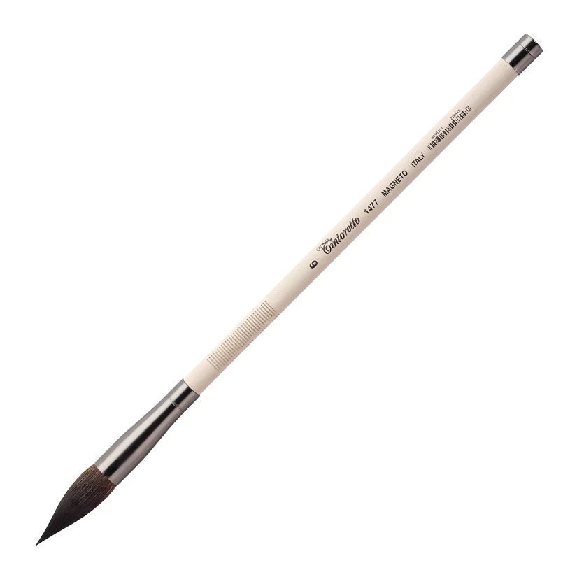 Pędzel Magneto 1477 Tintoretto to profesjonalny pędzel akwarelowy z innowacyjnym systemem magnetycznym i wodoodpornym, idealnie wyważonym trzonkiem Pędzel powstał na bazie tradycyjnych azjatyckich pędzli do kaligrafii i akwareli oraz popularnej serii 1407 Tintoretto, wprowadzając nowoczesne udoskonalenia Zamiast klasycznego sznureczka do zawieszania, Magneto posiada silny magnes na końcu trzonka, który umożliwia łatwe mocowanie pędzla do dowolnej metalowej powierzchni, chroniąc włosie i zachowując jego kształt